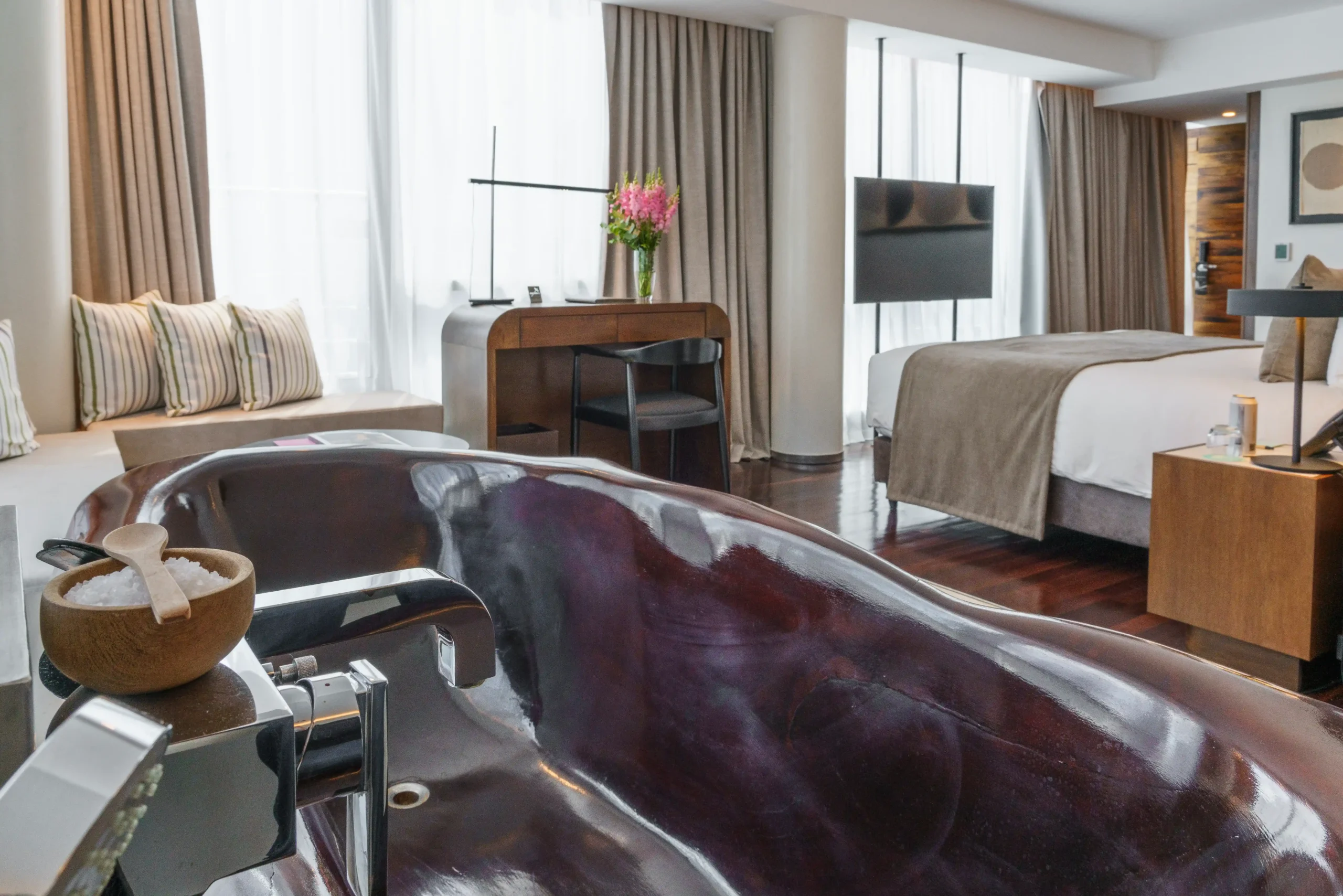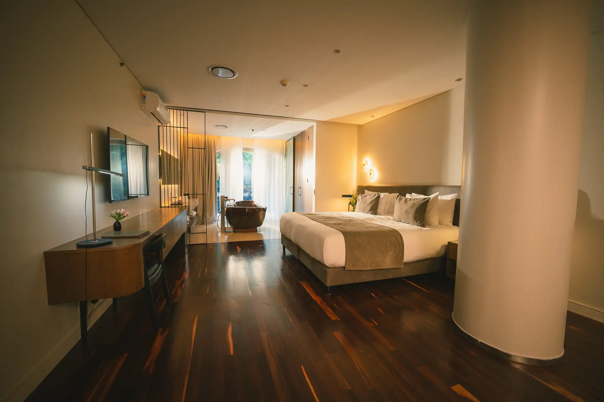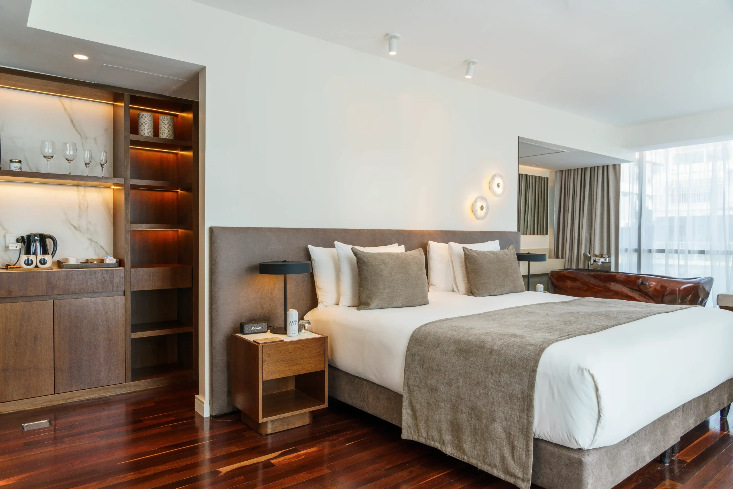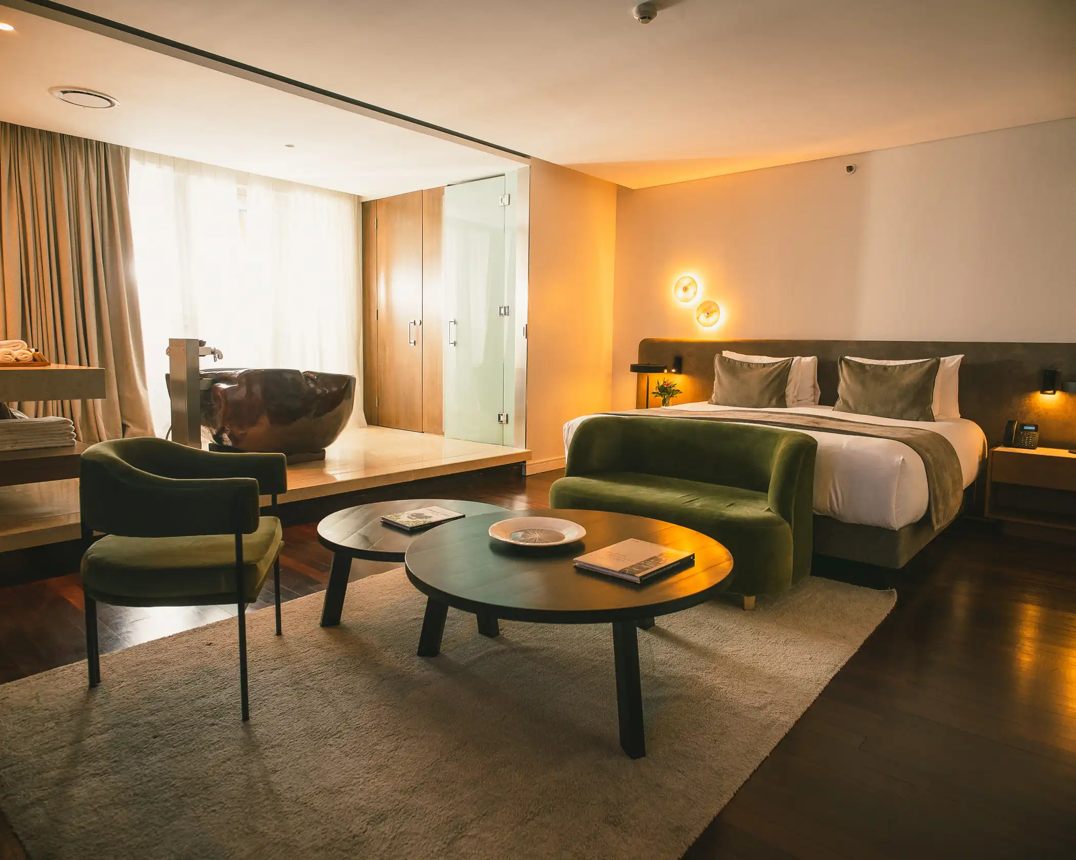 Las habitaciones priorizan la comodidad, con camas king-size, bañeras extragrandes y todas las comodidades. Cada una diseñada para que el espacio y la comodidad se fusionen.