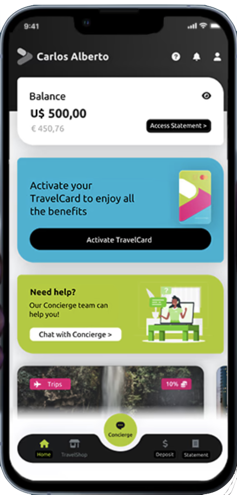 En la pantalla principal, podrás ver tu saldo e iniciar la atención con el conserje para usar tu cashback en tu próximo viaje.